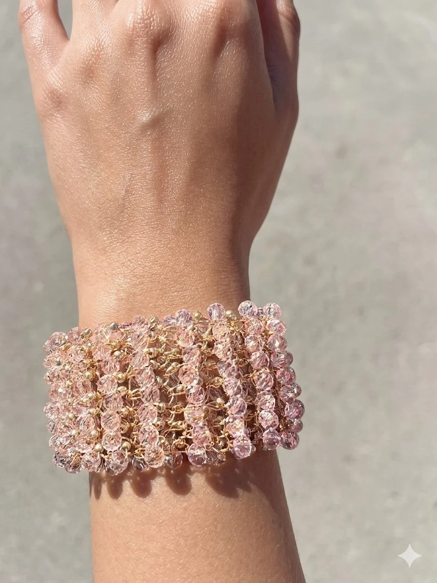 The Mariam Bracelet represents a complex fusion of metallurgy and light. By hand-integrating precision-cut crystal beads into the metal crochet framework, we have created a piece that captures and refracts light with every movement.